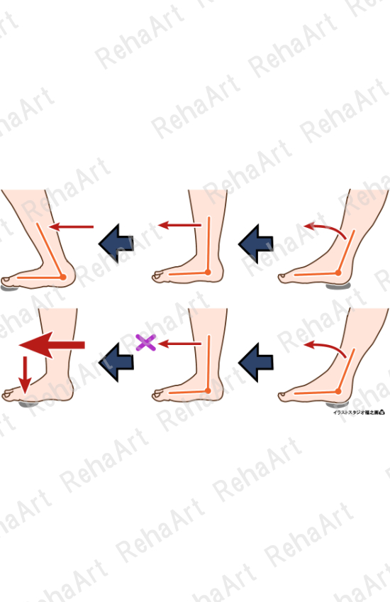 ●アンクルロッカー障害:正常(上段)と足関節背屈制限によるアンクルロッカー障害の図