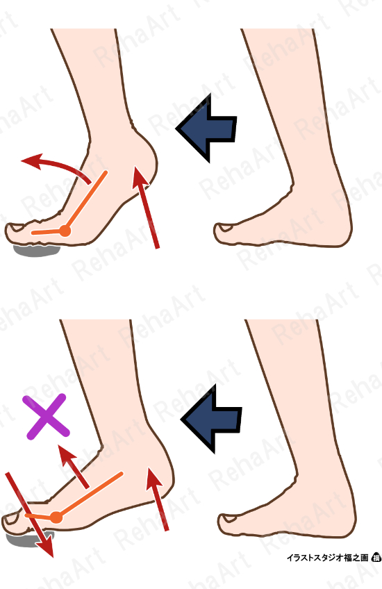 ●フォアフットロッカー障害:正常(上段)と第1中足趾節関節背屈制限によるフォアフットロッカー障害の図
