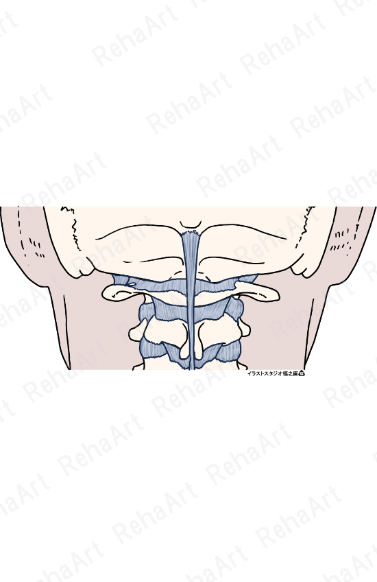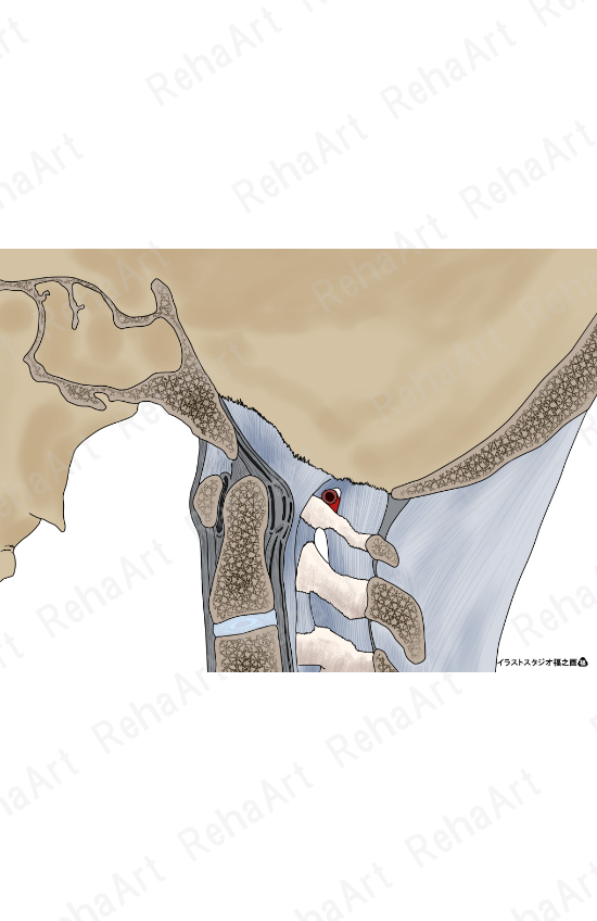 環軸関節・環椎後頭関節などのイラストです。 ●環軸関節(上面):環軸関節の上面の図 ●環軸関節(矢状面):環軸関節の矢状面の図(縦断面) ●環軸関節・環椎後頭関節(背面):環軸関節・環椎後頭関節の背面の図 ●環椎後頭関節(矢状面):関節を構成する後頭骨と環椎の縦断面を含めた矢状面の図 ●後環椎後頭膜・後環軸膜・項靭帯:後頭骨と頸椎上部を後方で補強する膜性・靭帯性の連続構造の図