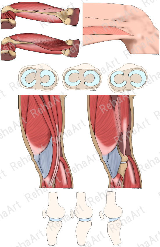 膝関節③:十字靭帯による大腿骨脛骨関節の滑り運動、内側側副靭帯と外側側副靭帯の屈曲に伴う緊張の違い、膝関節の屈曲・伸展運動での回転軸の移動、スクリューホームムーブメント①②(5点セット)