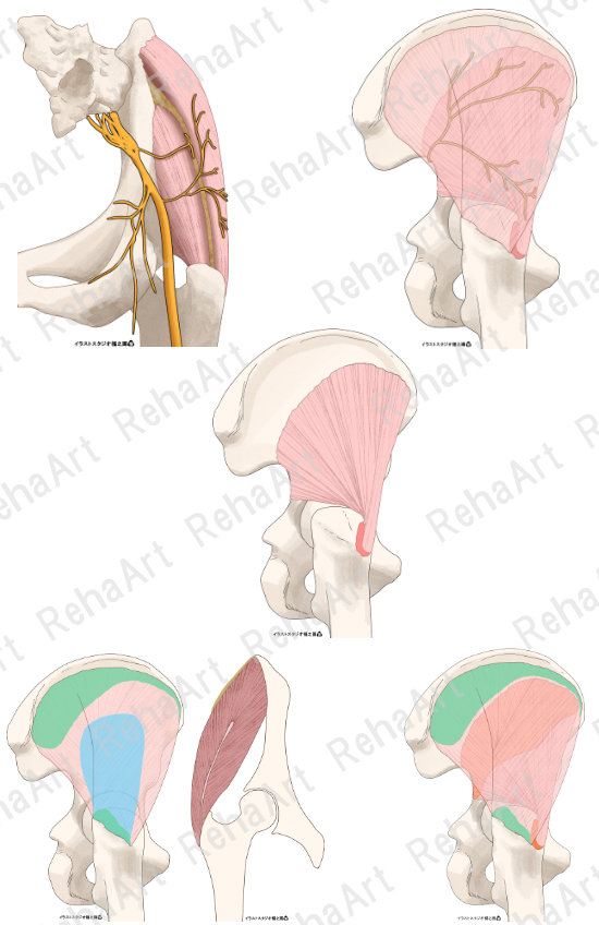 股関節24:上殿神経・小殿筋・中殿筋解剖図(5点セット)
