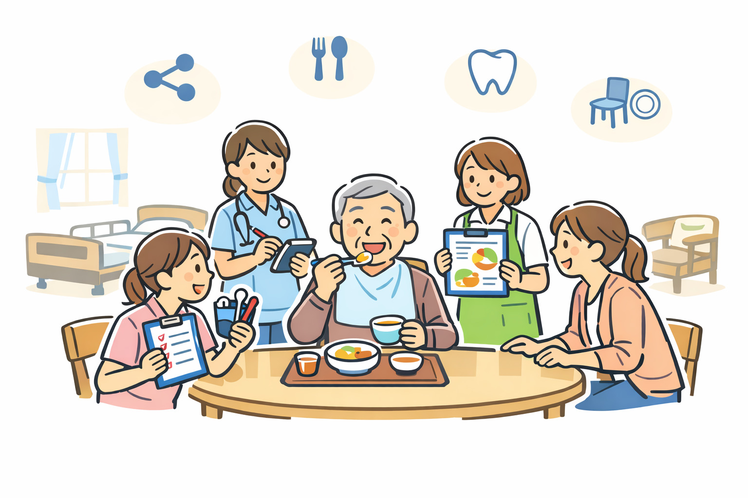 生活の場では、姿勢づくり、食形態、介助方法、服薬、口腔ケア、環境調整、家族の不安対応までが一体です。